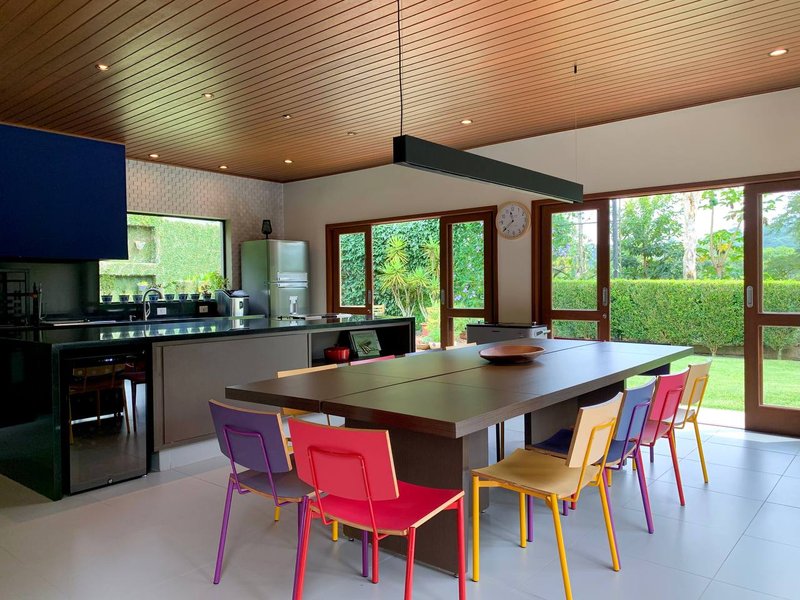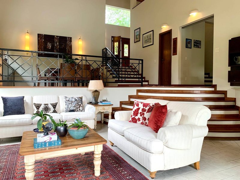 O sol entrando na sala através dos janelões, pé direito alto, a lareira, o cenário perfeito.